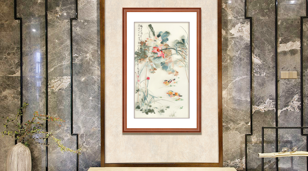 画面为刺绣,相框为实木,款式可选,图片展示所用相框并非固定,可根据客户要求,在我们现有的款式内,更换成自己所喜欢的。装裱风格多样,下单时请联系业务经理,注明所要的款式。